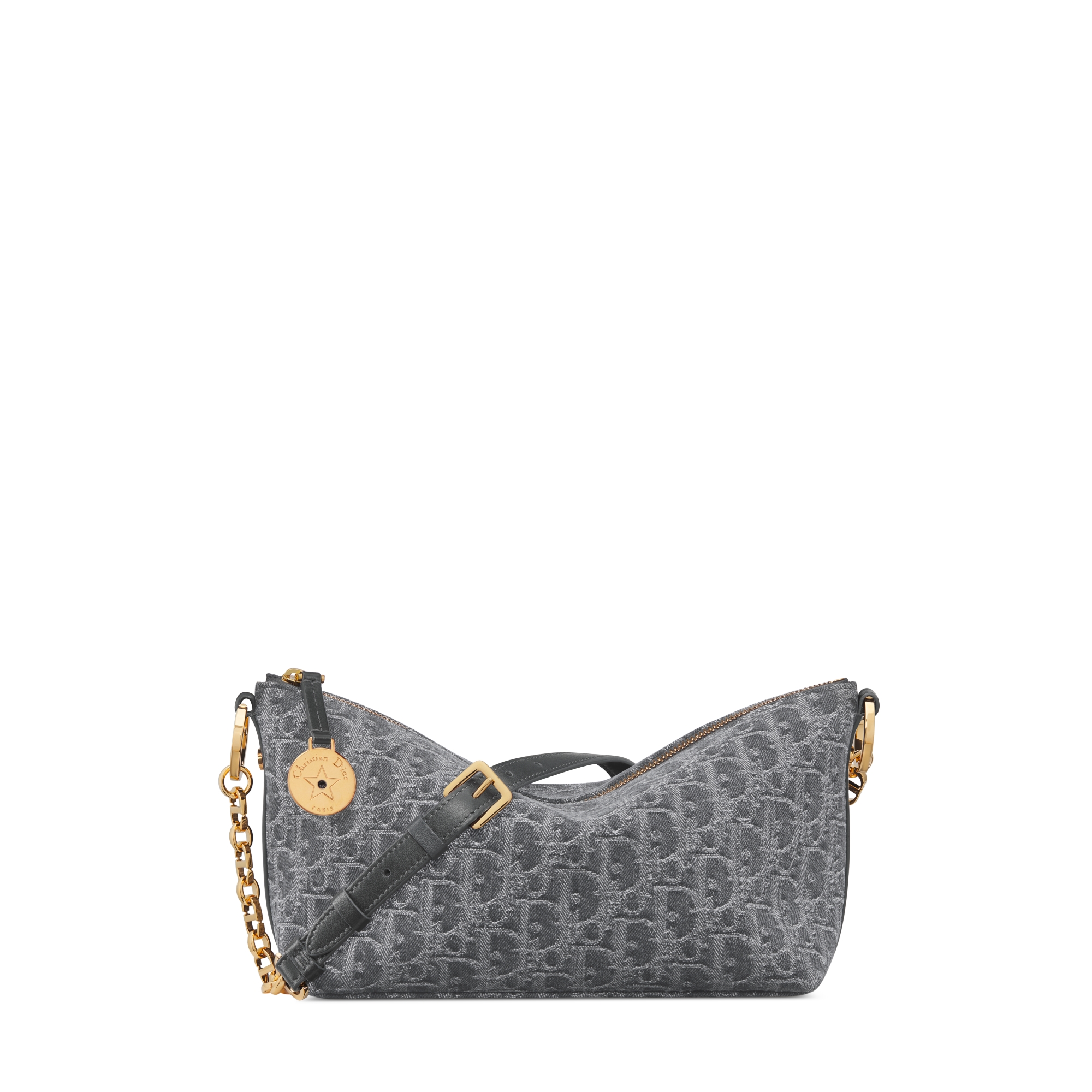 这款 Diorstar 链条水饺包造型时尚,设计实用,别具一格。廓形柔软,采用灰色 Denim Dior Oblique 提花面料等材质精心制作,重新诠释 Dior 经典图案。设有宽大的隔层,拉链开合搭配镌刻有 Christian Dior Paris 标志和 Dior 经典星星标识的圆形饰牌,侧面饰以精致的 CD 铆钉提升格调。内部设有卡槽,搭配可调节 CD 链环肩带,并带有皮革带,提升肩背时的舒适度。