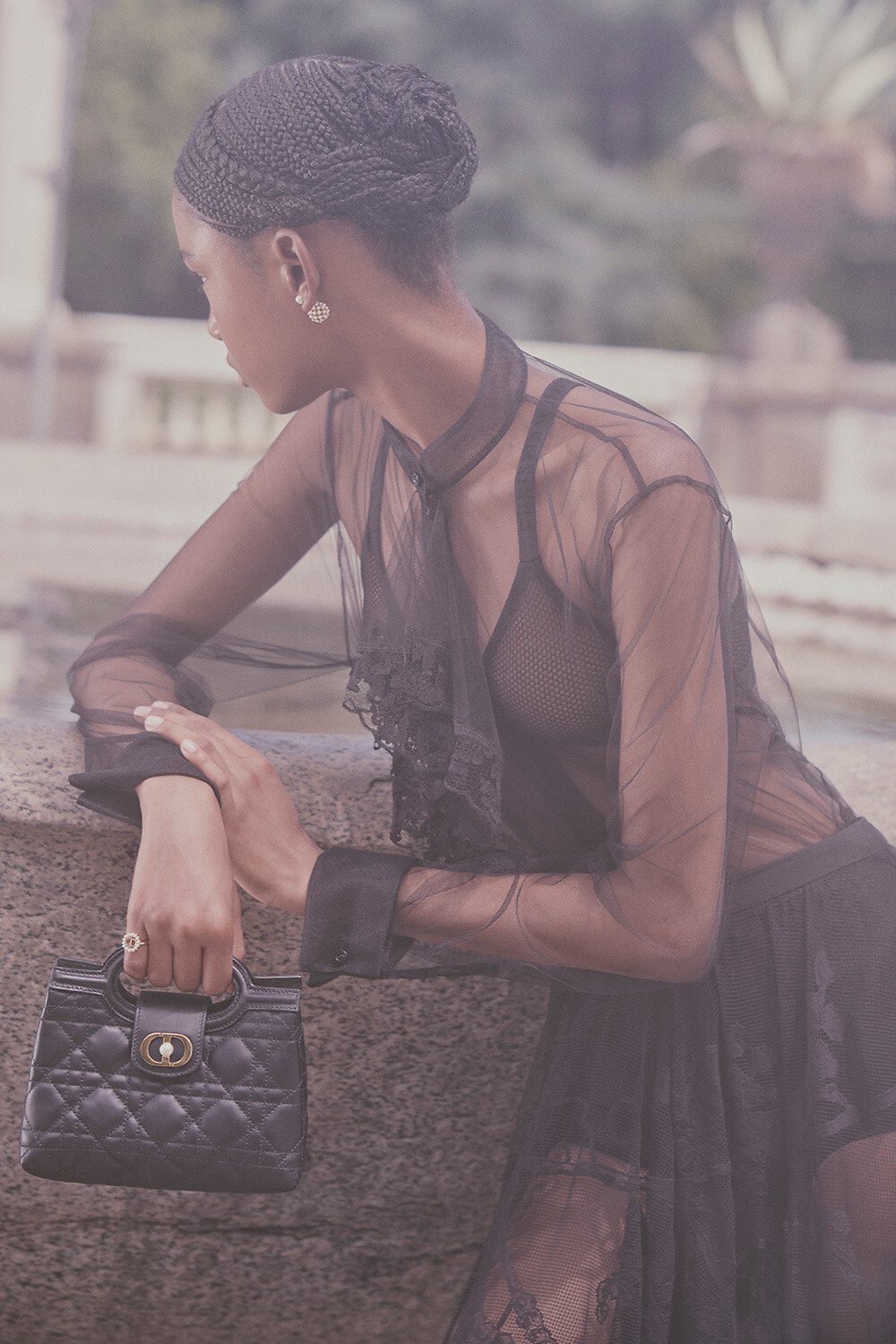 奶白色光滑牛皮革和白色 Oblique 印花面料搭配对比鲜明的黑色缉面线