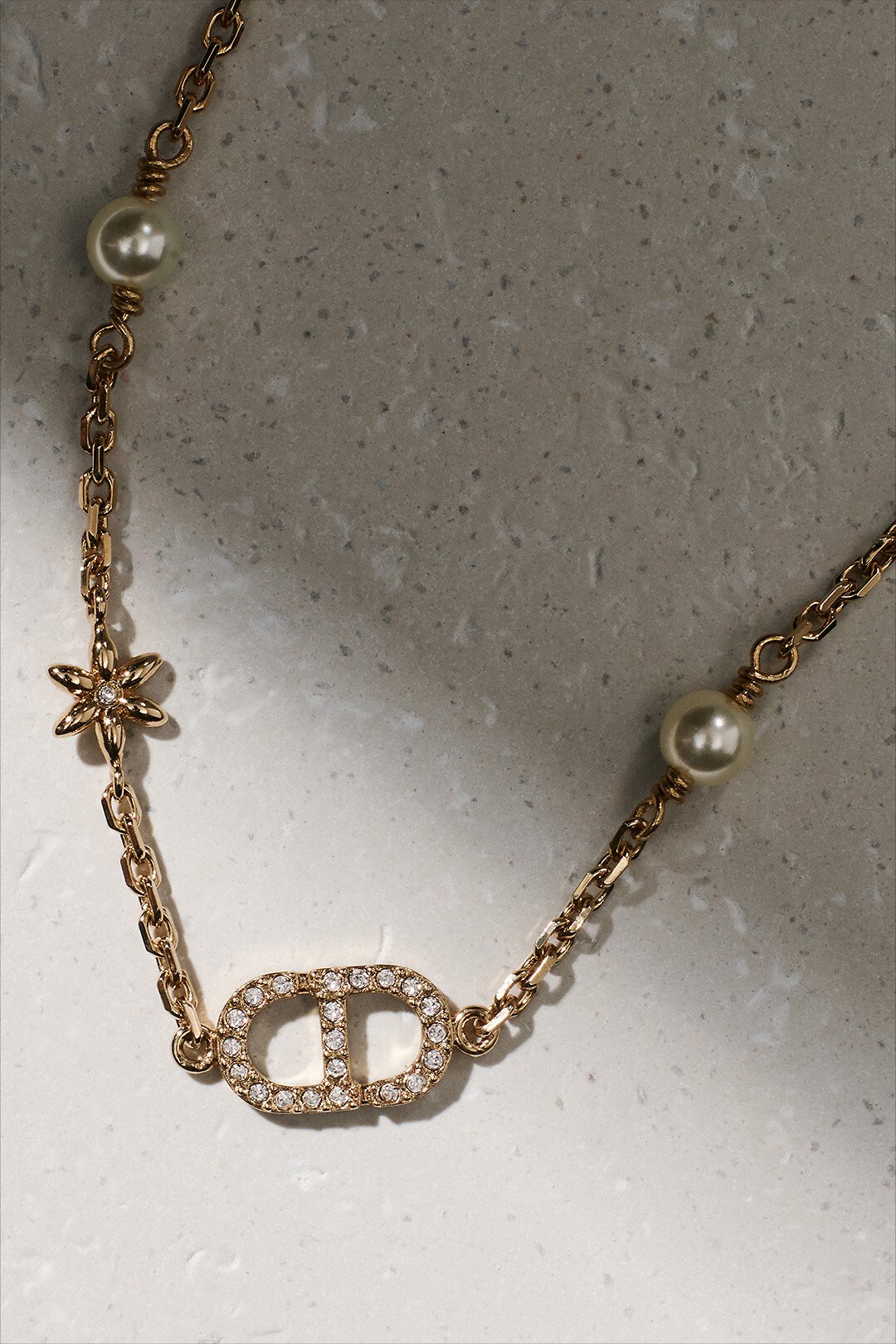 金色饰面金属搭配白色树脂珠饰和银色调晶体装饰