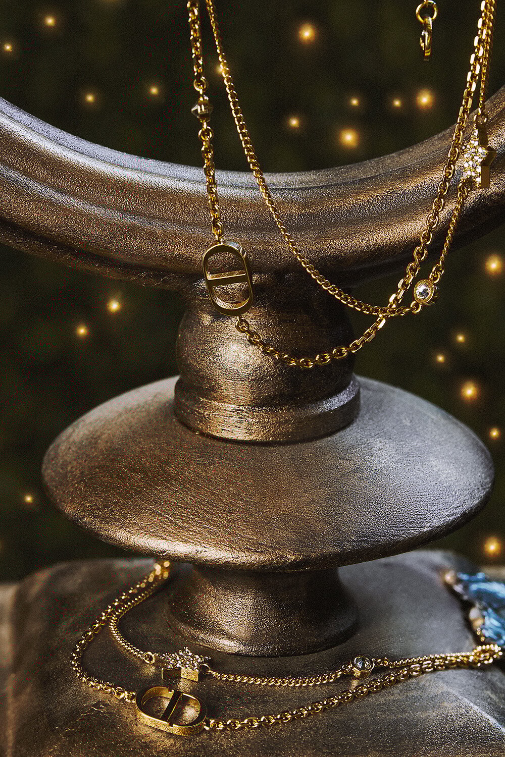 金色饰面金属、白色树脂珠饰、银色调晶体和深海蓝色玻璃装饰
