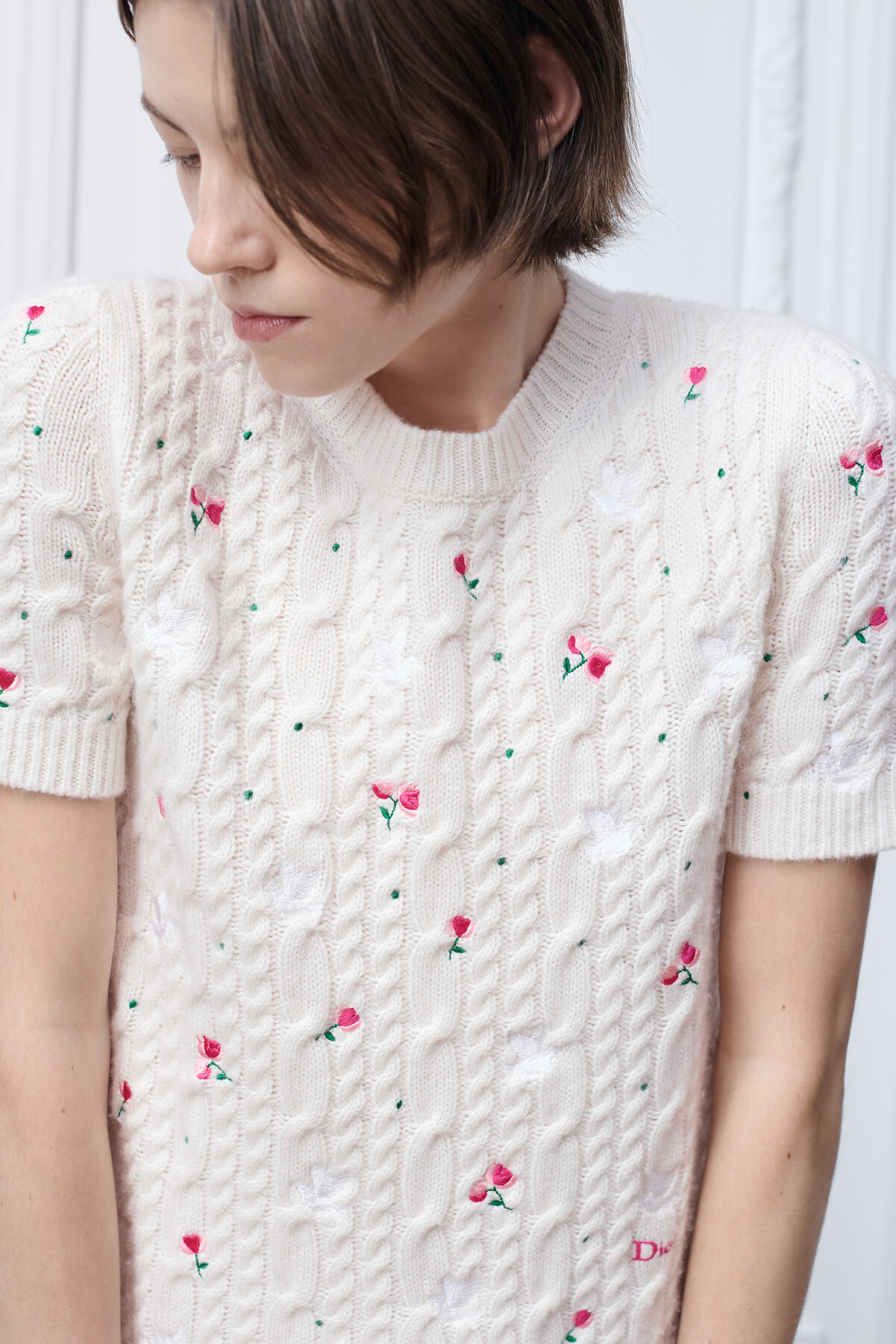 米白色山羊绒绞花针织面料多色 Doves & Roses 图案刺绣
